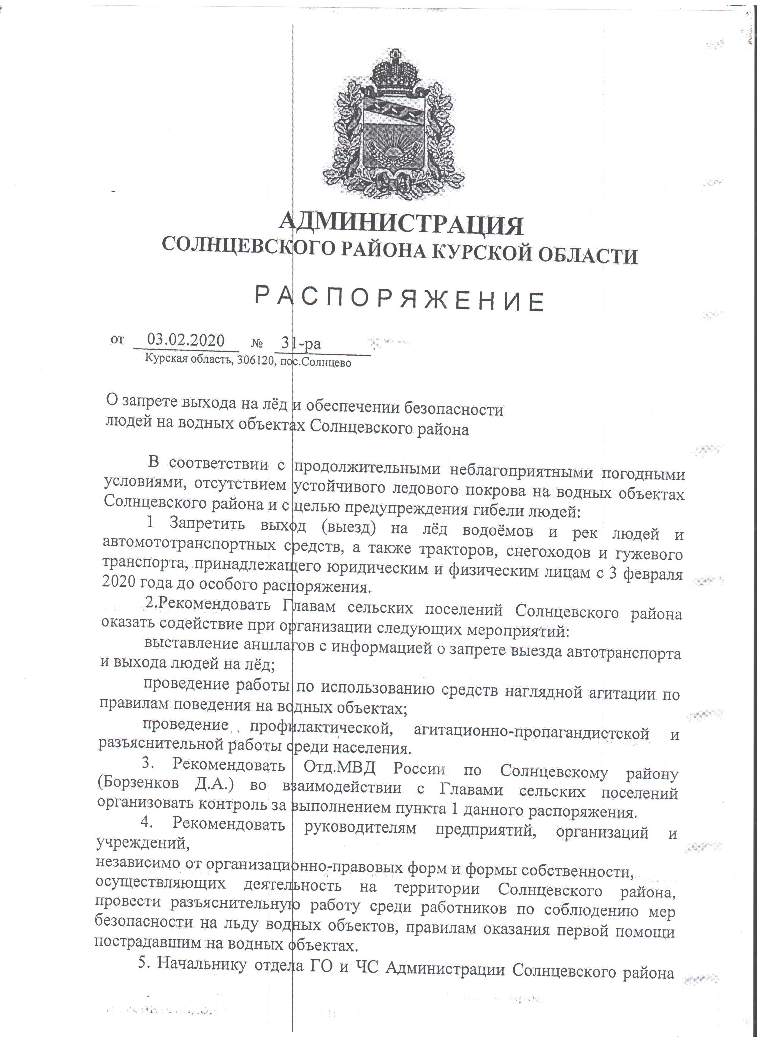 Распоряжение от 03.02.2020 №31-ра "О запрете выхода на лед и обеспечении безопасности людей на водных объектах Солнцевского района"